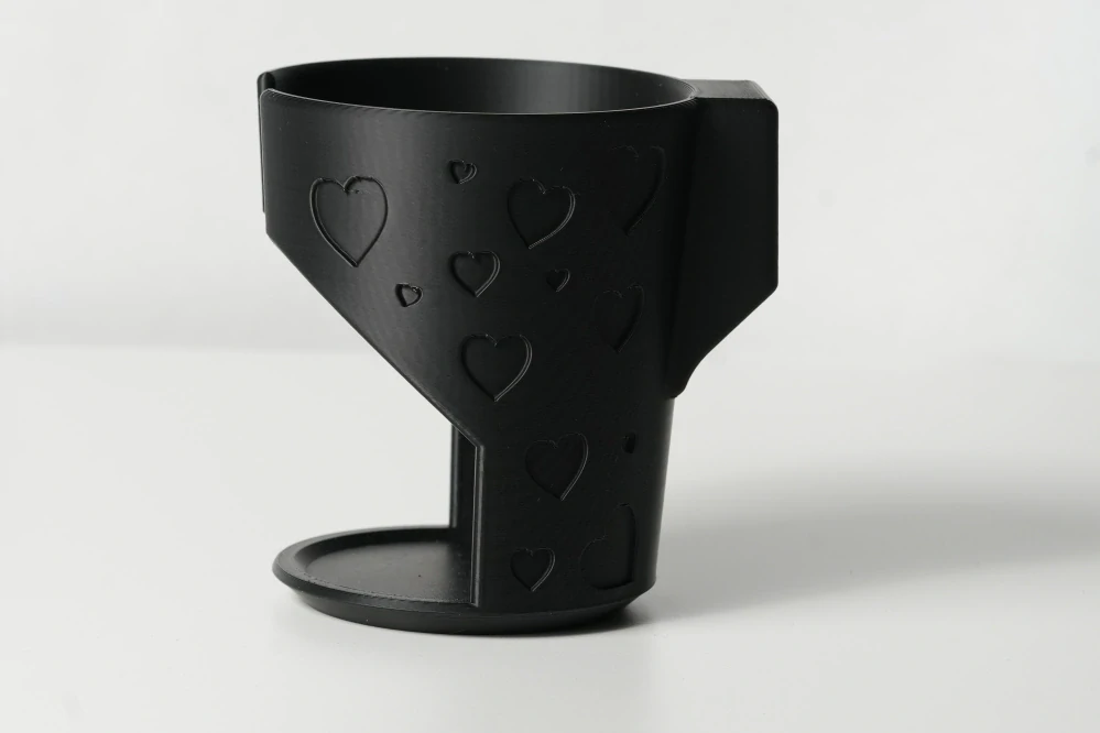 Tento 3D tištěný držák na nápoje je stylový a praktický doplněk pro kočárky značky Bugaboo*. Elegantní motiv srdíček dodá vašemu kočárku osobitý vzhled a zajistí, že svůj oblíbený nápoj budete mít vždy po ruce – ať už jste na procházce ve městě nebo v přírodě.