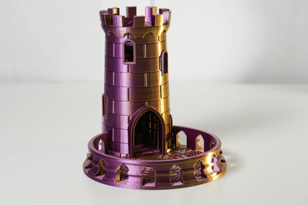 Vnitřní konstrukce s několika přepážkami zaručuje férové a plynulé házení kostek, které končí v dolním zásobníku připravené k dalšímu hodu. Díky preciznímu 3D tisku z kvalitního PLA materiálu působí věž moderně, pevně a stane se ozdobou každé herní partie.