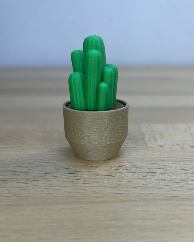 K dispozici je ve světlejším nebo tmavším odstínu zelené a s různými barvami květináče. Každý kus je vyroben metodou 3D tisku z PLA plastu.