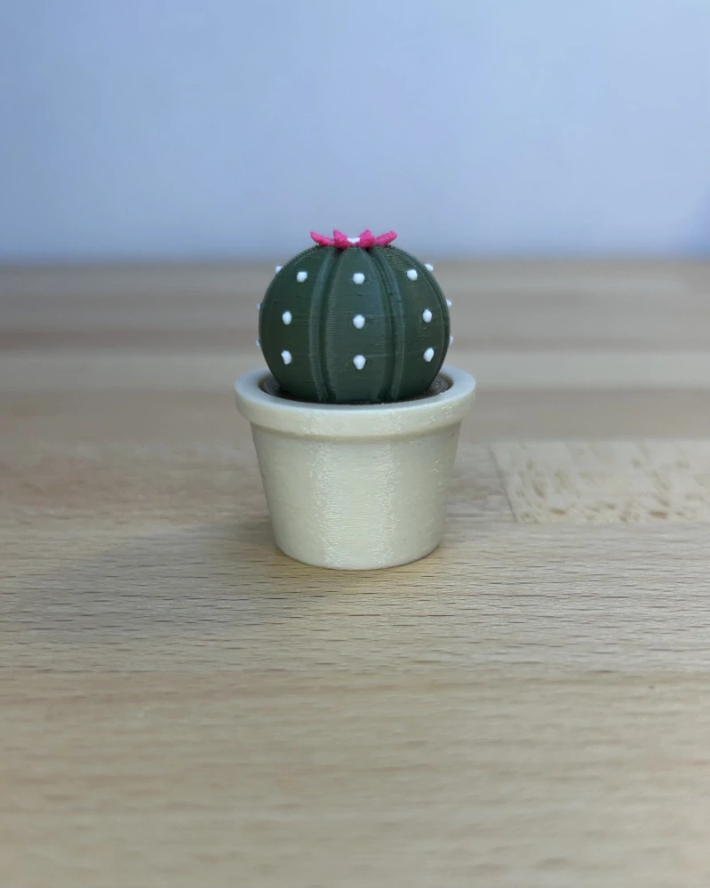 Kulatý 3D tištěný kaktusový clicker s květem a příjemným kliknutím při stisku. Antistresová pomůcka, která ozdobí pracovní stůl a zároveň nabídne zábavný mechanický prvek. Volba barvy kaktusu i květináče. celý popis