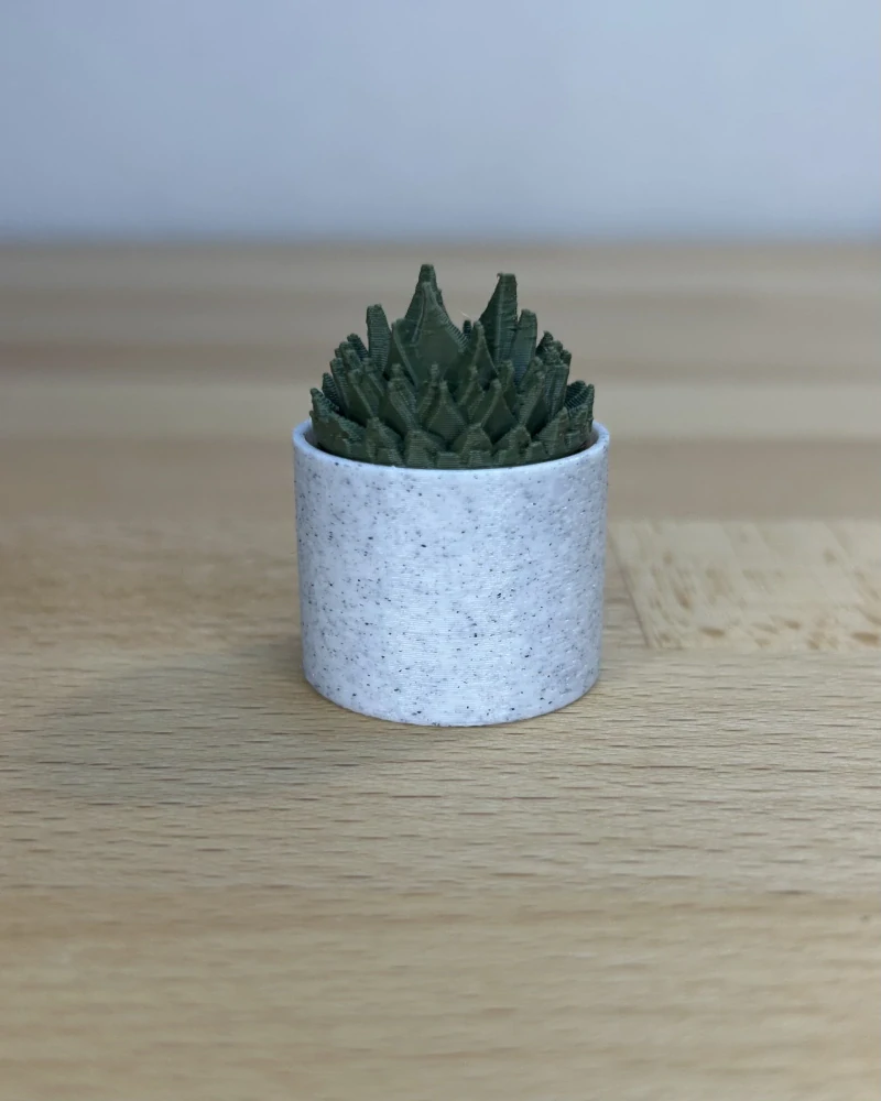 K dispozici je ve světlejším nebo tmavším odstínu zelené a můžete si zvolit také barvu květináče. Každý kus je vyroben pomocí 3D tisku z PLA.