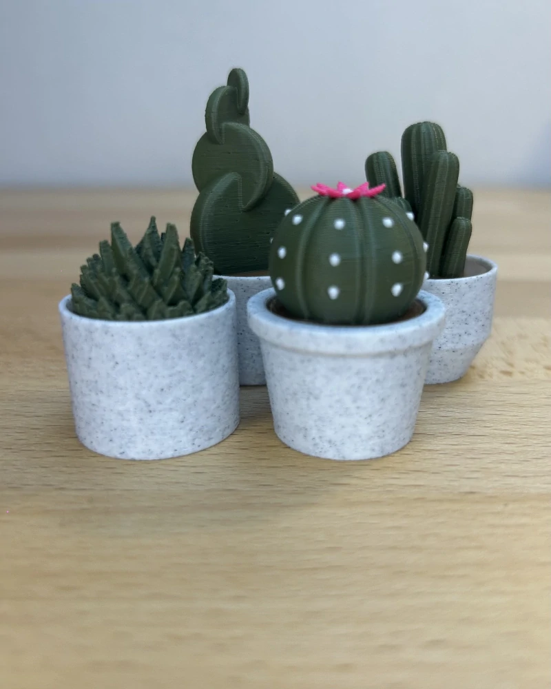 Set 4 různých 3D tištěných kaktusových clickerů se spínačem uvnitř a příjemným kliknutím při stisku. Celá sada je barevně sladěná – všechny kaktusy mají stejný odstín zelené a stejné provedení květináče. celý popis