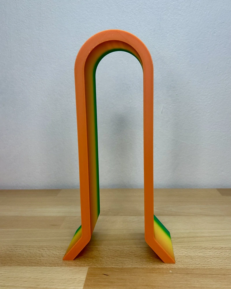 Stojánek je vyroben pomocí 3D tisku z duhového filamentu. Každý kus má jedinečný barevný přechod, který vzniká přirozeně při tisku – žádné dva kusy nejsou zcela stejné.