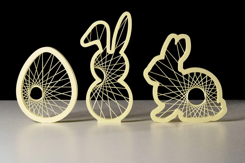 Velikonoční Stringující 3D Tištěný Set Dekorací Vneste do svého domova jedinečnou a moderní velikonoční atmosféru s naším stringujícím velikonočním setem z 3D tisku! Tato dekorace je vyrobena technikou „string art“, která vytváří jemné, geometrické linie připomínající napnuté nitě. T... celý popis