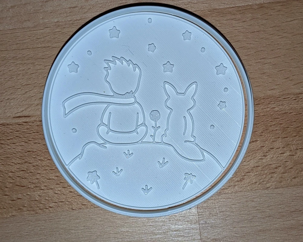 Kulaté vykrajovátko s jemným reliéfem inspirovaným poetikou příběhu Malého prince – princ, liška a hvězdy na malé planetce. Detaily krásně vyniknou při otisku do modelovací, samotvrdnoucí nebo polymerové hmoty, takže se skvěle hodí pro tvoření dekorací, ozdob i drobných dárků.
